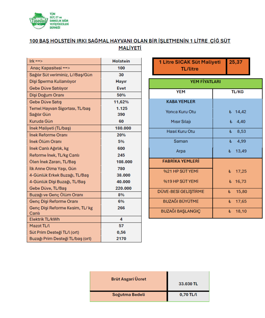 Derneğimiz maliyet komisyonu; günlük ortalaması 30 litre olan 100 baş sağmal kapasitesine sahip bir işletmeyi baz almakta, reforme inekler yerine konacak düveler dışındaki düveleri de satarak sürü büyüklüğünü 100 başta sabit tutan bir işletme için maliyet hesaplamaktadır. Hesaplamalarımızda çiğ süt prim desteği ve buzağı desteği dikkate alınarak, gelir olarak belirtilmiştir.